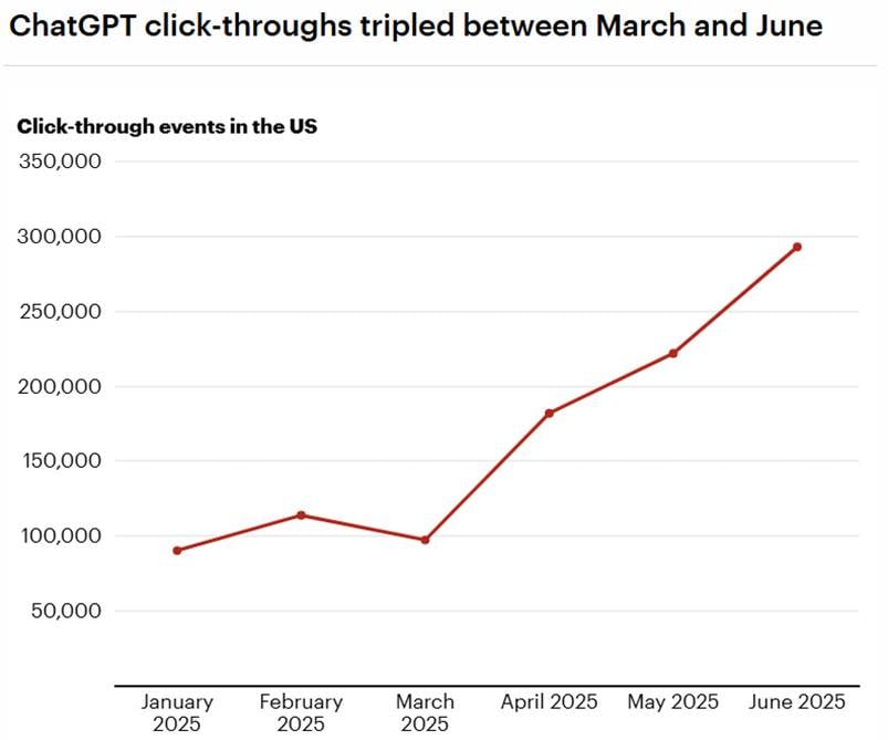 There has also been an increase in the number of links added to ChatGPT’s replies: click-throughs tripled between March and June 2025, from 100,000 to 300,000!