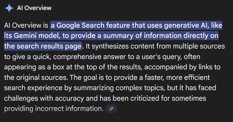 The advent of generative AI has also had a major impact on how we consume content when conducting traditional searches on search engines. In spring 2024, Google introduced the AI Overview – an AI-based evolution of the snippet (the box at the top of the search page showing an extract from the most relevant result). This function uses AI to generate an automatic summary that provides an instant response to questions of varying levels of complexity. Here, for example is the AI Overview explaining… the concept of the AI Overview 😋:
