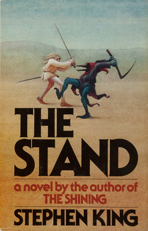 The first edition of The Stand was published on 3 October 1978 by Doubleday. The cover is not what you’d expect. Or at least not what you’d expect today for a Stephen King book: it shows two mysterious mediaevalesque figures – one light, one dark – engaged in hand-to-hand combat against an immense but indistinct backdrop. It’s almost as if they’ve spilled out of a Hieronymus Bosch painting mid-battle.