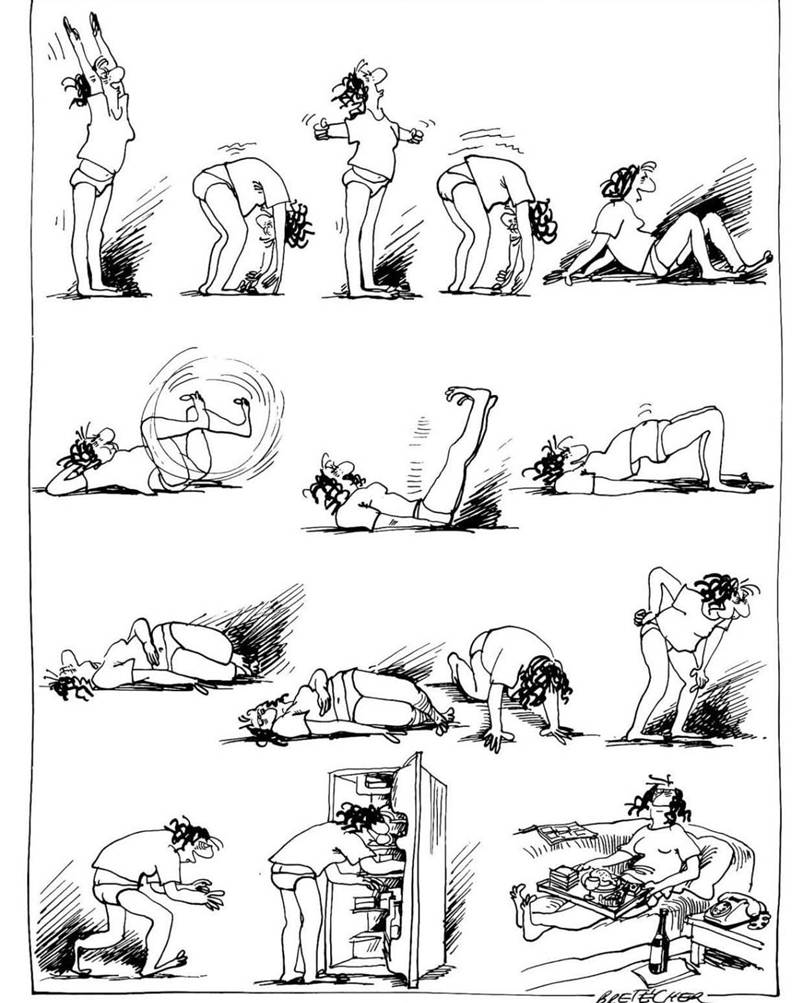 A panel by Claire Bretécher. – © Dargaud – https://www.facebook.com/YogaKamalaAudrey/posts/en-ce-1er-avril-le-yoga-vu-par-claire-bretecher/1162617265656756/