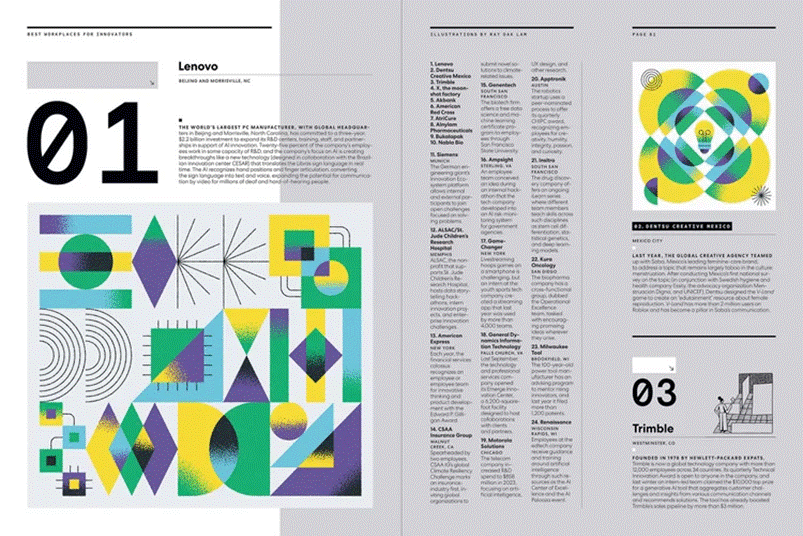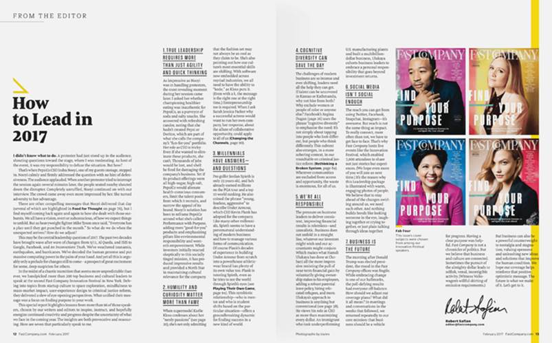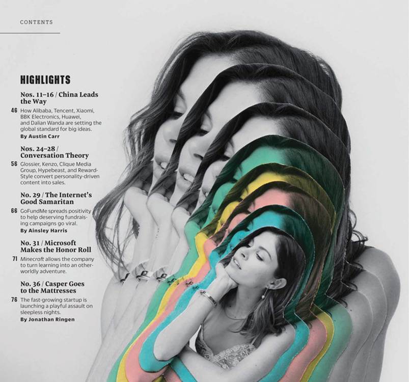The masthead is instantly recognisable. It uses stylised lettering based on the Grifo font, with a couple of idiosyncratic touches: the “A” in “FAST” is a lot smaller than the surrounding letters, as is the “O” in COMPANY”, which is also nestled inside the “C”. These choices tell us that we’re about to open a smart but creative magazine that’s a far cry from the staid publications of the traditional business press.