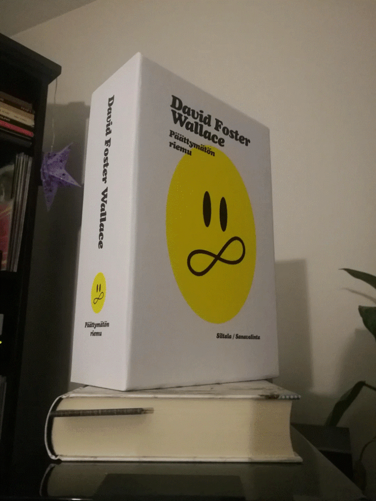 A yellow smiley was chosen for the Finnish edition of Infinite Jest that came out in 2020. The smiley is a recurring image in Foster Wallace’s novel, but the author subverts its typically positive meaning by making it the symbol of a terrorist group.