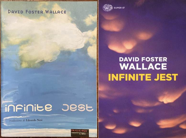 The first translation of Infinite Jest was Italian: the book landed in Italy in 2000. Published by Fandango, the cover for the first Italian edition of Infinite Jest keeps the original motif of blue sky and white clouds, as does the later edition published by Einaudi.