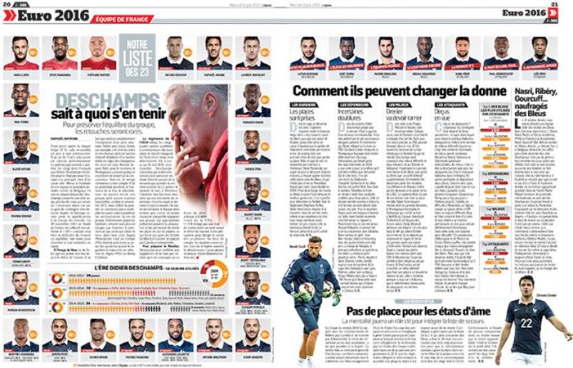 The newspaper does not make heavy use of illustrations or infographics, preferring to concentrate on photo journalism. Indeed, L’Équipe‘s use of photos is seen as its main design strength, as can be seen from its covers.