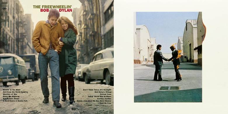 Other inspirations include the cover to The Freewheelin’ Bob Dylan [which we talked about here], released 30 years earlier, and Wish You Were Here by Pink Floyd, which also has two mysterious men on the front.