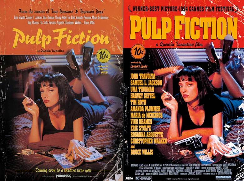 In the new version, the book was replaced by an imaginary novel titled Pulp Fiction, the cigarette brand was obscured and, for reasons unknown, the pistol was made more prominent. The font for the title was also swapped out for a chunkier one. [If you want to learn more about fonts used by Quentin Tarantino, we’ve got a whole article on it].