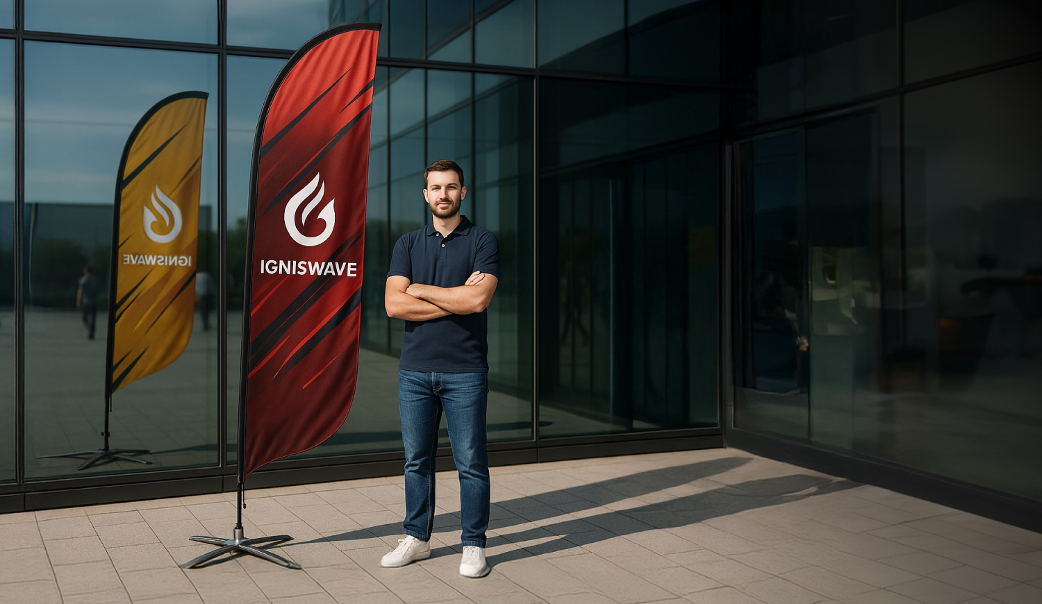 - Banderole Display: These fabric flags feature an aluminium structure and a water or sand-fillable base. If you want to increase visibility for your business outdoors, this option is perfect due to its material's high durability. Like the previous custom flags, it is available in various sizes (XS, S, M, and XL).
